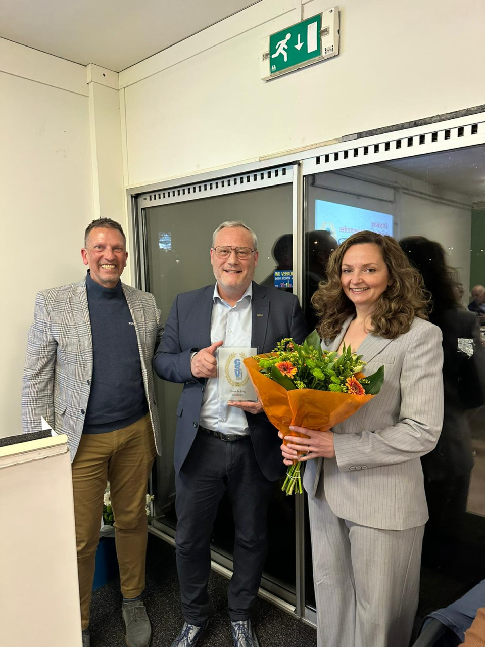Tijdens de jubileumviering op 12 april 2025 heeft de GSV de Koninklijke Erepenning ontvangen. Burgemeester Melissant-Briene reikt hem op de foto uit aan voorzitter Ron Collé.